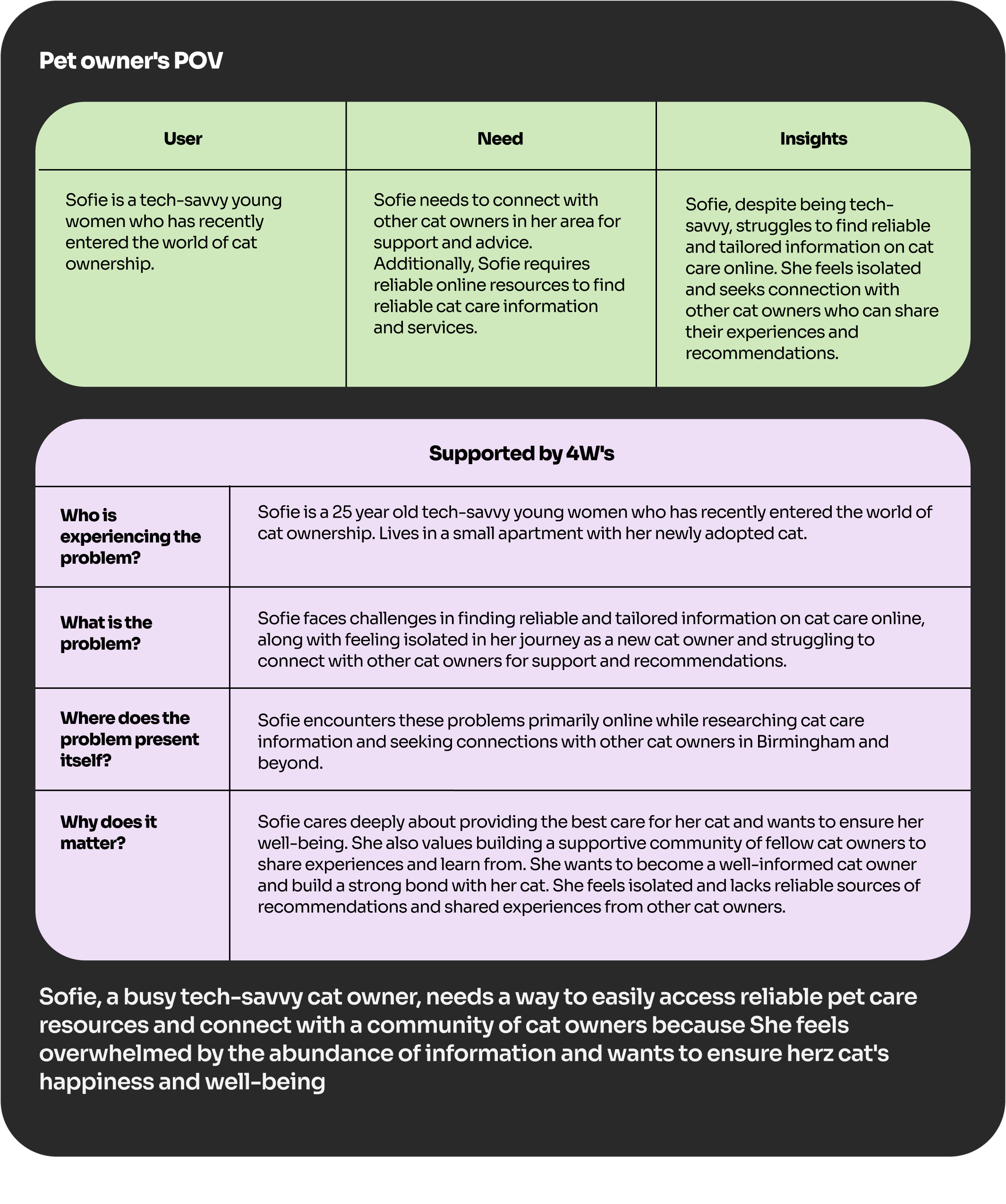 2. Pet Owners: They highlighted the challenge of finding reliable pet care services and felt overwhelmed by the initial responsibilities of pet ownership. They needed resources and support readily accessible in one place.